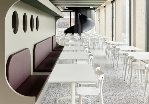 Der Mensa-Neubau für die Hochschule Luzern in Rotkreuz komplettiert das Angebot des Hochschulcampus. Die Architekten entschieden sich für eine Holzhybrid-Bauweise und betonten das Material durch die dunklen Akustiksegel. Die linearen Strukturen, die die Fassade gliedern, werden über die dunklen Holzlamellen wieder aufgenommen. Diese prägen nicht nur den Raum, sondern lassen auch die unabdingbare Haustechnik elegant in den Hintergrund treten.