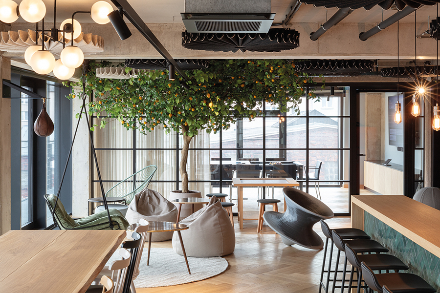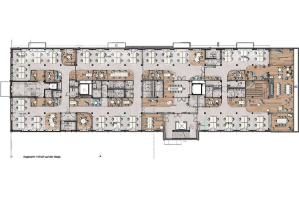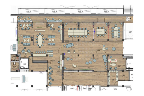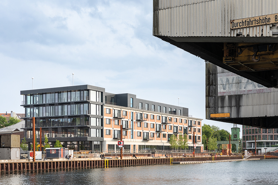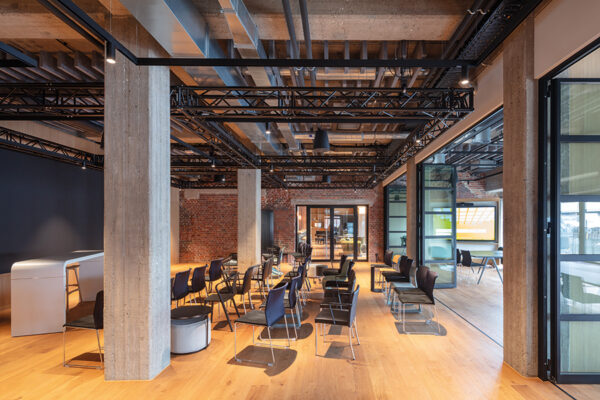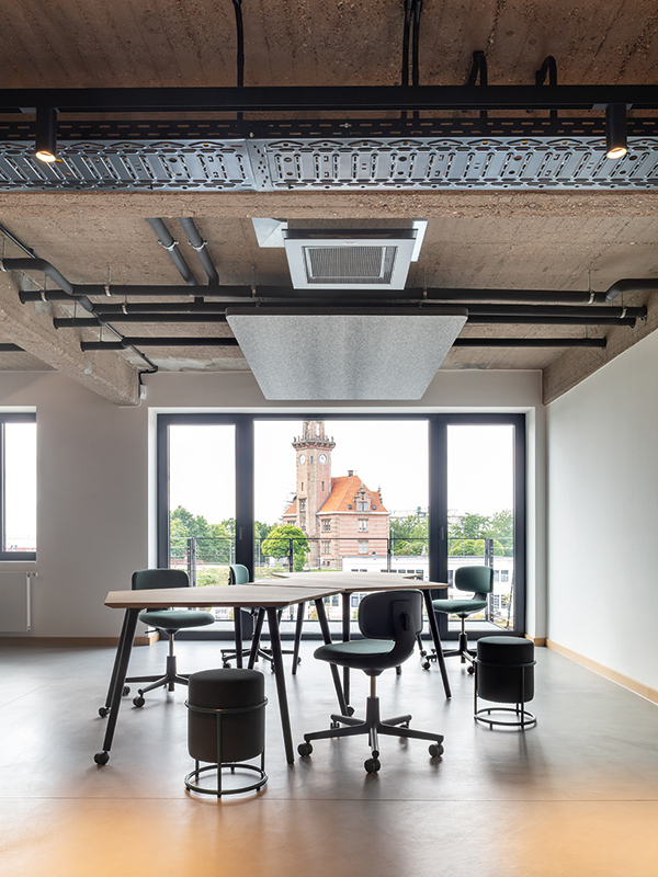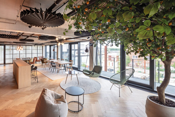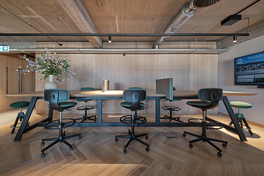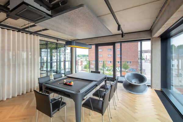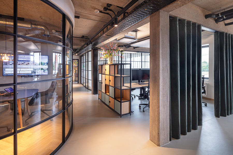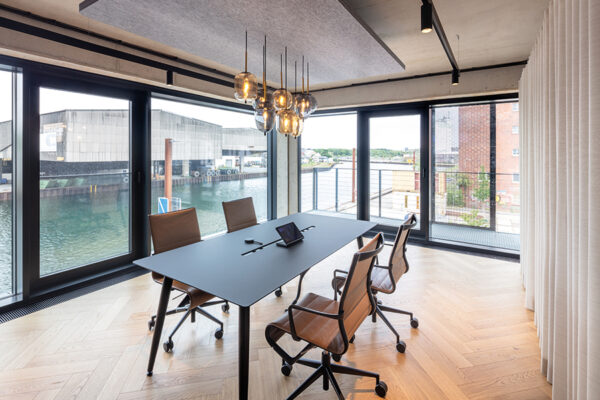Wo früher Waren lagerten, entsteht heute ein Arbeitsumfeld für vernetzte Medienproduktion. Fischgrätparkett und Holzeinbauten bringen Ruhe in die rohe Materialität, ohne den industriellen Charakter zu verwischen. Unter dem Motto „Transparent. Lokal. Vernetzt.“ entstand auf 1700 Quadratmetern ein Digital Hub für die Unternehmensgruppen von Lensing Media. Im Dortmunder Hafenviertel entstand so aus einem ehemaligen Speichergebäude der sogenannte Lensing Media Port – architektonisch geplant von SHA Architekten und innenräumlich gestaltet von JOI-Design. Die große Gebäudetiefe wird über ein klares Tageslichtprinzip organisiert: Arbeitsplätze orientieren sich klassisch entlang der Fensterachsen, während der Kern Fokusräume, Workshopflächen und agile Arbeitsformate bündelt. Vorhänge legen sich als flexible Schichten vor die offenen Flächen und bilden Rückzugsnischen für konzentriertes Arbeiten. Entlang des verglasten Anbaus staffeln sich über alle Etagen Kommunikationsbereiche, ergänzt um ein Restaurant mit Hafenterrasse, einen Clubraum und ein Konferenzzentrum. Bodentiefe Fenster rahmen Meetingräume mit Hafenblick; glasierte Fliesen, Kauehaken als Garderobe und aufgearbeitete Leuchten verbinden Bestand und Re-Use. js