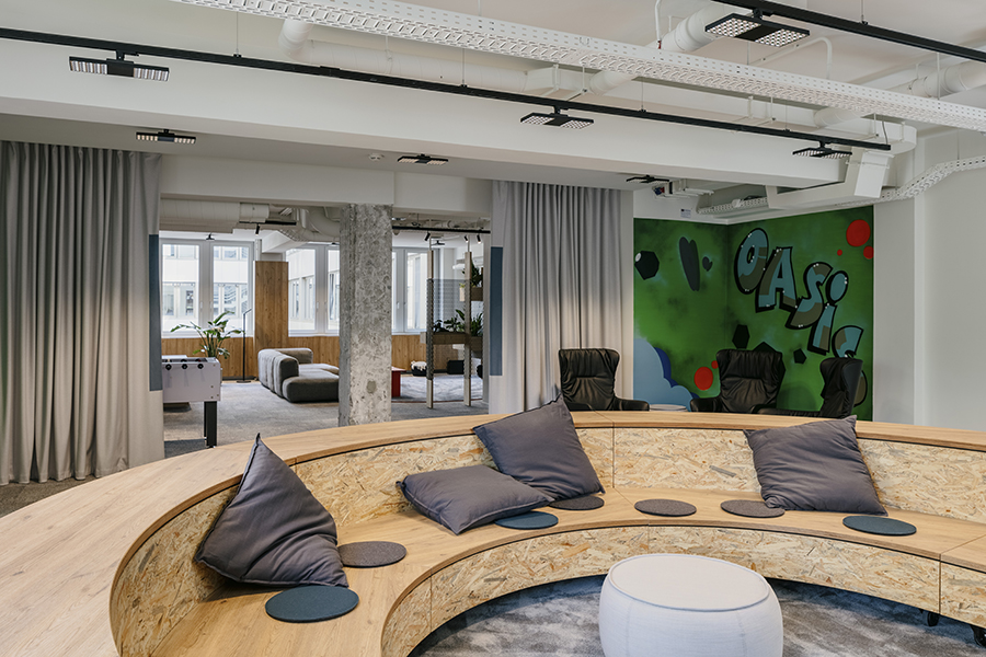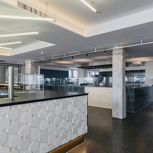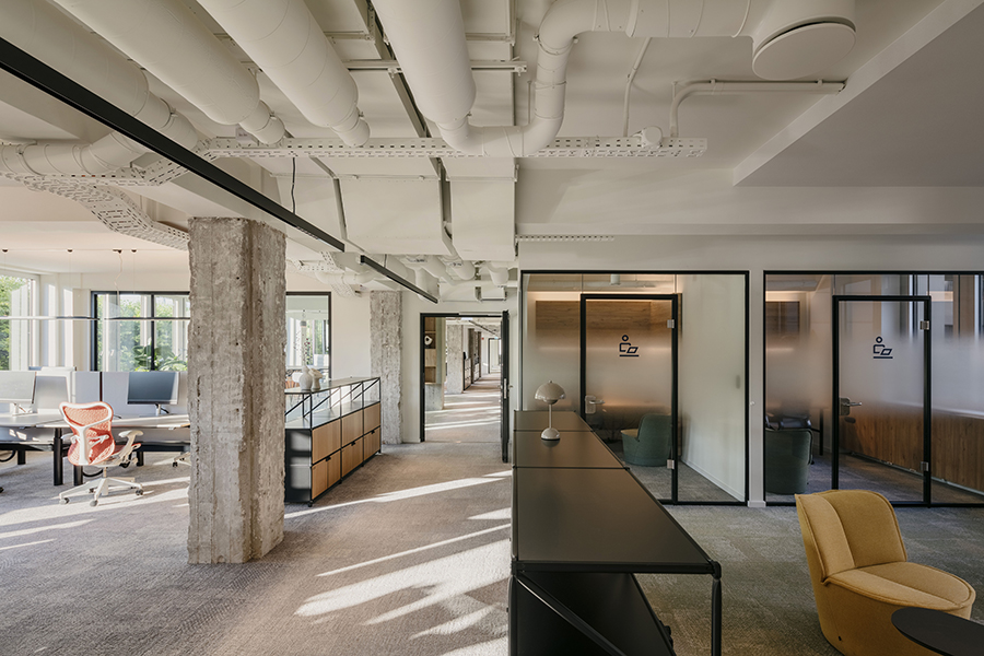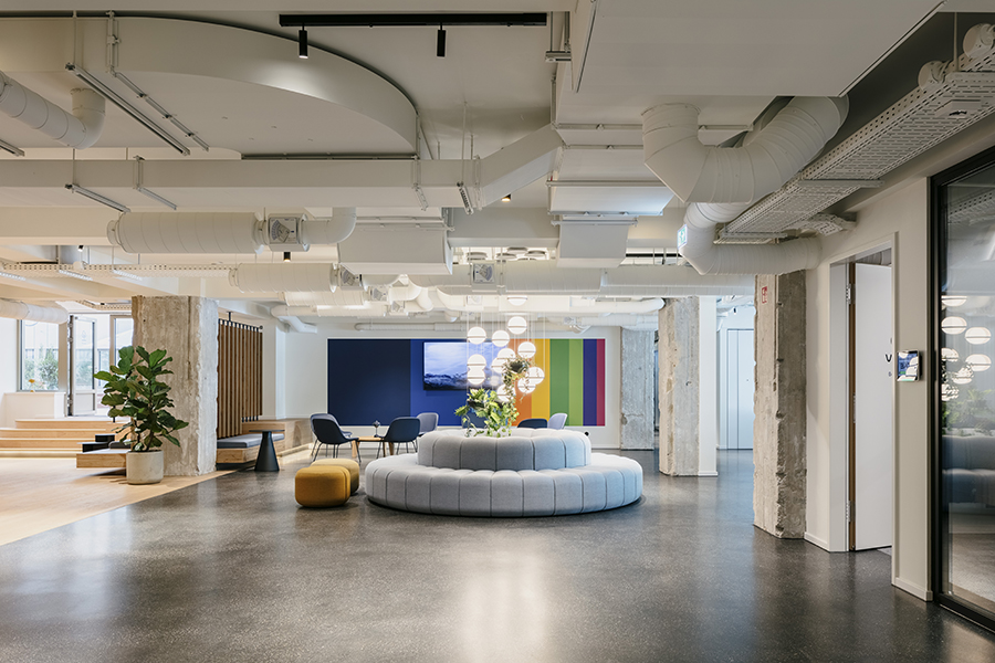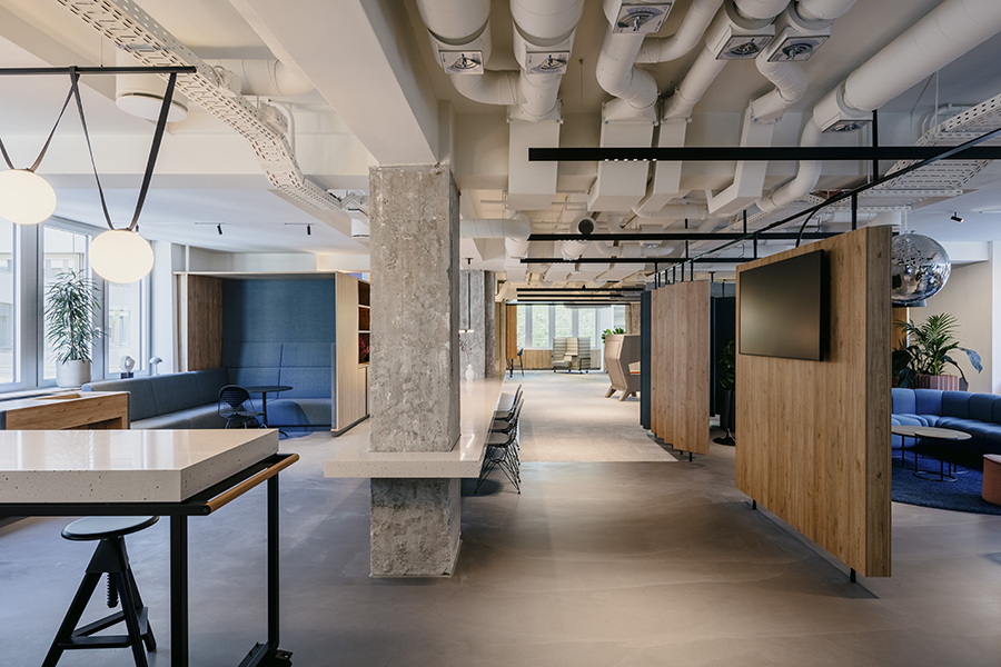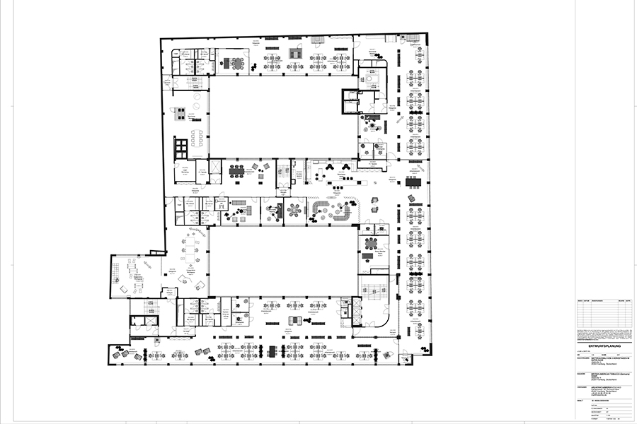 Um für die Mitarbeitenden von BAT Germany ein zukunftsfähiges Arbeitsumfeld zu schaffen, erhielt das Architekturbüro Ratschko den Auftrag, das an der Hamburger Alster gelegene Bestandsgebäude aus den 1930er-Jahren grundlegend zu modernisieren. Die zuvor von Zellenbüros und langen Korridoren geprägte Struktur wich einer offenen, multifunktionalen Bürolandschaft mit 8500 Quadratmetern, die Activity-Based-Working unterstützt. Bereits 2008 hatte das Architekturbüro kleinere Anpassungen vorgenommen, nun jedoch wurde das Konzept radikal weitergeführt – mit klarer Wirkung auf die Unternehmenskultur. „Früher sagten Mitarbeitende: ,Ich gehe in mein Büro‘ und meinten ihr Einzelbüro. Heute bezeichnen sie damit die gesamte Fläche“, erläutert Kai Ratschko. Offene Arbeitszonen mit weiten Blickachsen, flexible Teamräume, Telefonboxen, Konzentrationsarbeitsplätze, Sitzgruppen und gemütliche Alkoven ermöglichen unterschiedliche Arbeitsweisen. Herzstück jedes Geschosses ist eine Teeküche, die Begegnung und Austausch fördert. Orientierung schaffen farbliche und materielle Zonierungen: Kommunikationszonen sind in Blautönen akzentuiert, während Glastrennwände, Regelsysteme und Nischen Rückzug und Sichtschutz ermöglichen. Sichtbar belassene Haustechnik sowie freigelegte Betonstützen und -wände setzen einen rohen Kontrast zu den neuen, maßgefertigten Möbeleinbauten. js