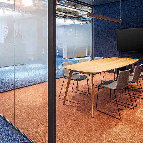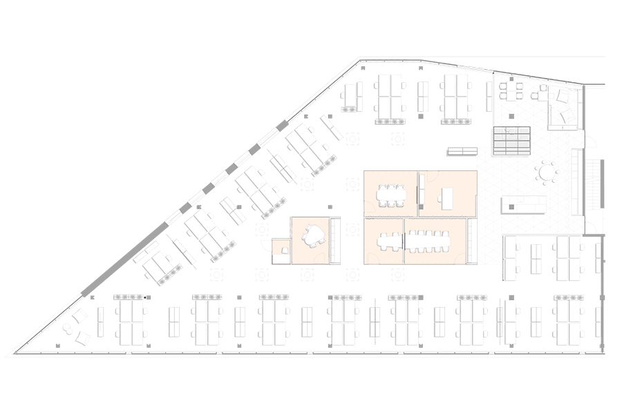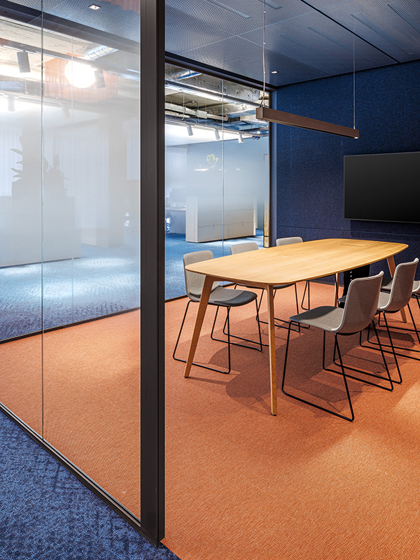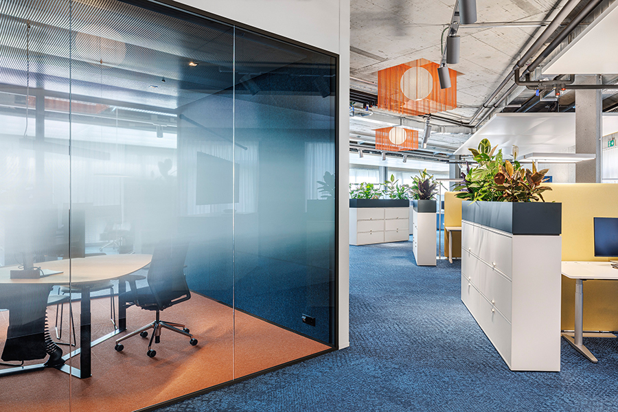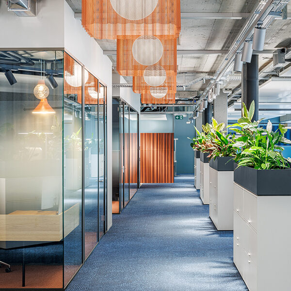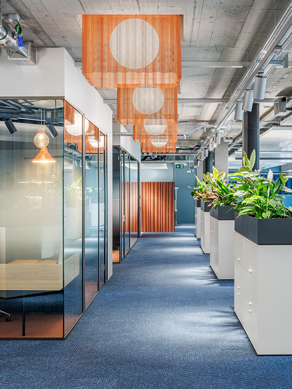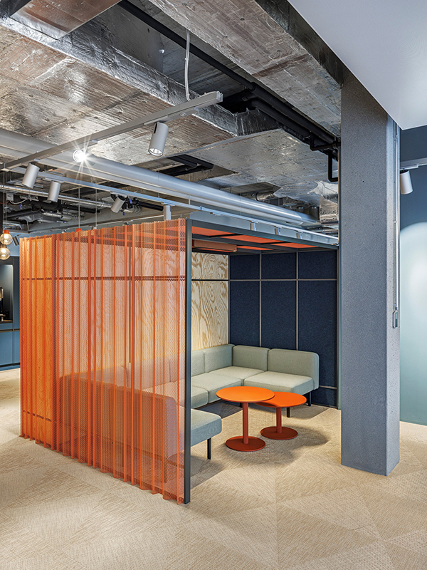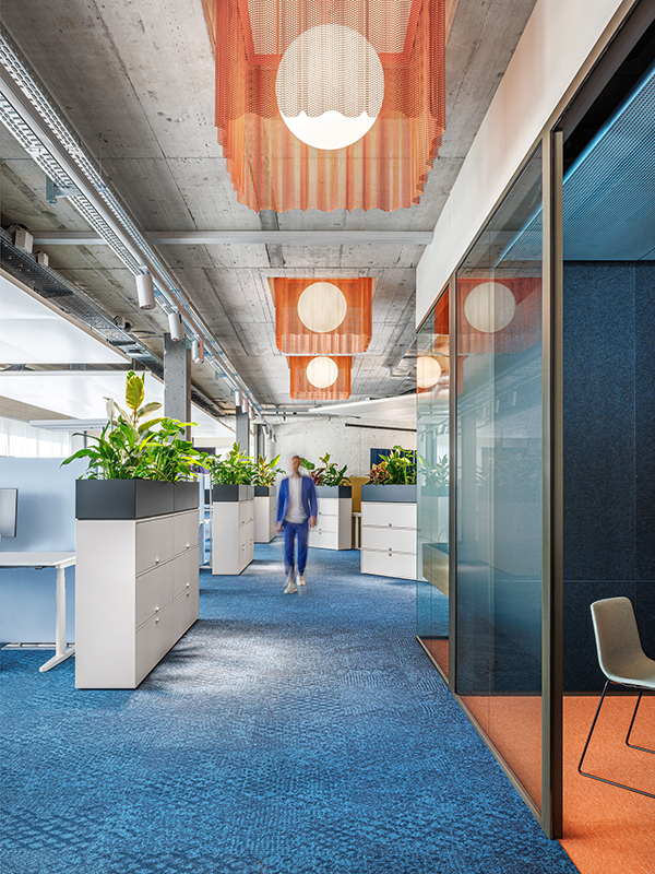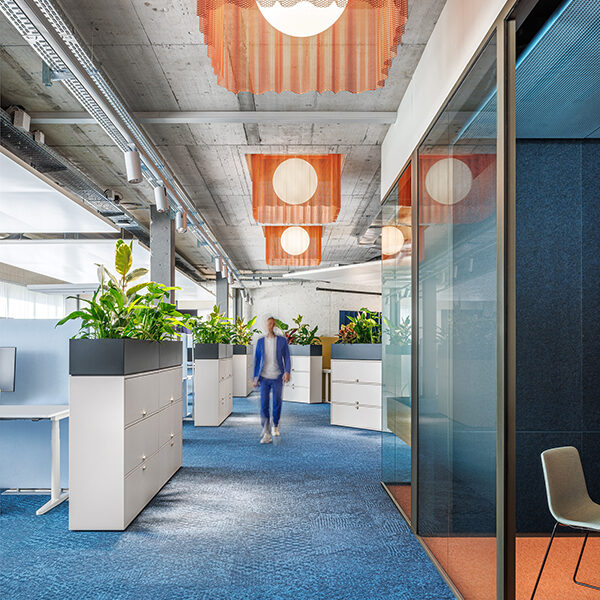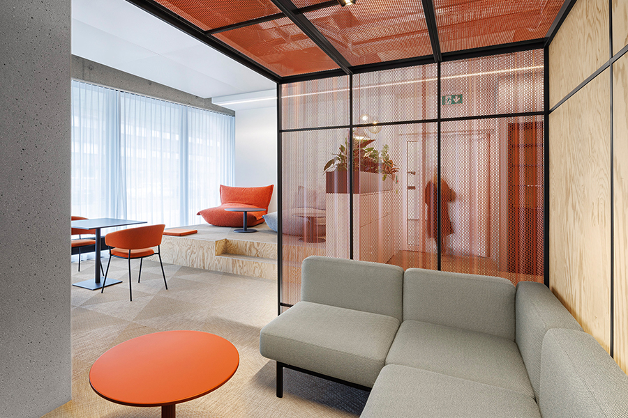 In Baar setzt die Gehri AG für die Zuger Kantonalbank auf einen präzise austarierten Dialog zwischen rohem Bestand und feiner Gestaltung. In einer ehemaligen Ausstellungshalle für Kühlgeräte entstand eine flexibel nutzbare Bürolandschaft für rund 60 Mitarbeitende. Nach der Entkernung blieb die freigelegte Konstruktion weitgehend sichtbar; einzig der Boden erhielt einen textilen Belag. Davor entfaltet sich ein hochwertiges Interieur aus Raum-in-Raum-Modulen in Stahl und Glas, orangefarbenem perforiertem Trapezblech und Seekiefer – ein bewusst gesetzter Kontrast zum industriellen Hintergrund. Eingefasst in das Blech sorgen die rhythmisch platzierten Leuchten für eine gleichmäßige Ausleuchtung in der offenen Arbeitszone. In Kombination mit Grünpflanzen und textilen Akzenten in Blau und Orange entsteht eine Arbeitsatmosphäre, die das urbane Umfeld reflektiert und zugleich den offenen, zukunftsorientierten Anspruch der Zuger Kantonalbank räumlich übersetzt. js