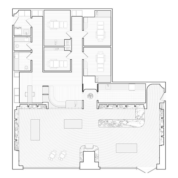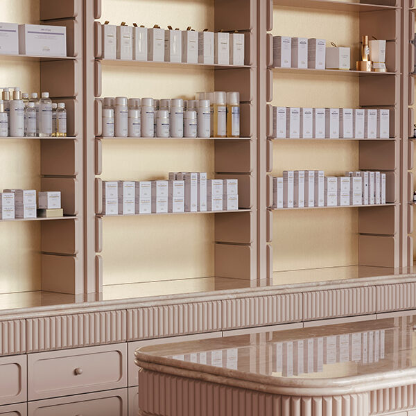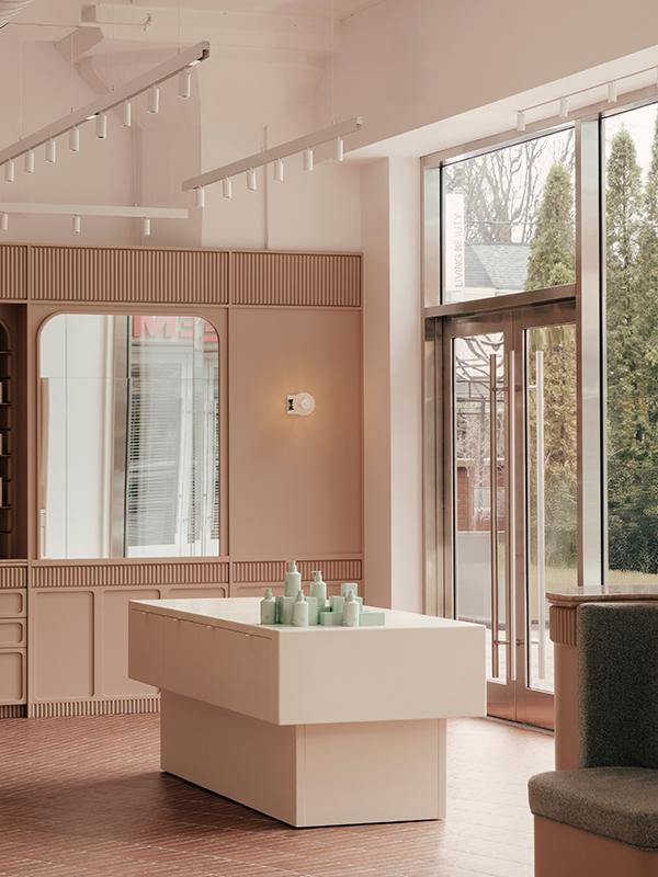 Der erste Flagship Store des kanadischen Kosmetiklabels Living Beauty eröffnete in Toronto – und folgt damit einem vertrauten Gestaltungsnarrativ: Wer im Premiumsegment der Beautybranche bestehen will, inszeniert sich heute im Stil klassischer Apotheken. Zwischen kuratierter Nostalgie und pointierter Selbstinszenierung changiert auch die Gestaltung von Odami (Arancha González Bernardo und Michael Fohring) – zeitgenössisch interpretiert, materialbewusst umgesetzt. Ein geschwungener Mittelblock trennt Beratungs- von Rückzugszonen und dient gleichzeitig als Stauraum sowie Displayfläche. Eine Oberfläche aus poliertem Breccia-Oniciata-Marmor zitiert das klassische Apothekenbild. Statt dunkler Holzeinbauten setzen roséfarbene Schreinerarbeiten – lackiert in „Templeton Pink“ und mit zahllosen kleinen Schubladen versehen – einen überraschenden Akzent. Jede Nische wird zum individuellen Beratungscounter, ausgestattet mit Marmoroberflächen, Sitzgelegenheiten oder Waschbecken. Ein Bodenmuster aus terrakottafarbenen Feinsteinzeugfliesen zieht sich schwungvoll durch den Raum und markiert den Übergang in den privateren Spa-Bereich – ein kraftvolles Statement zwischen Verkauf und Pflegeerlebnis. js