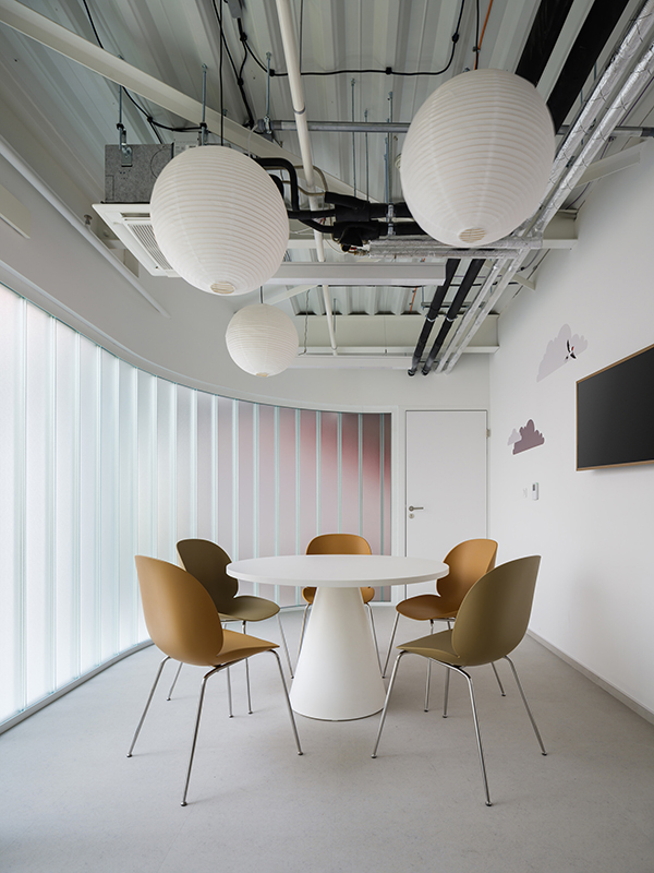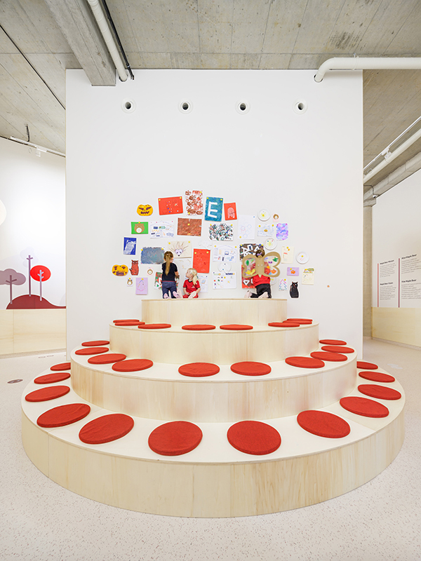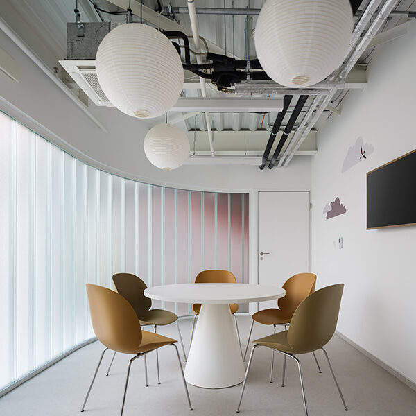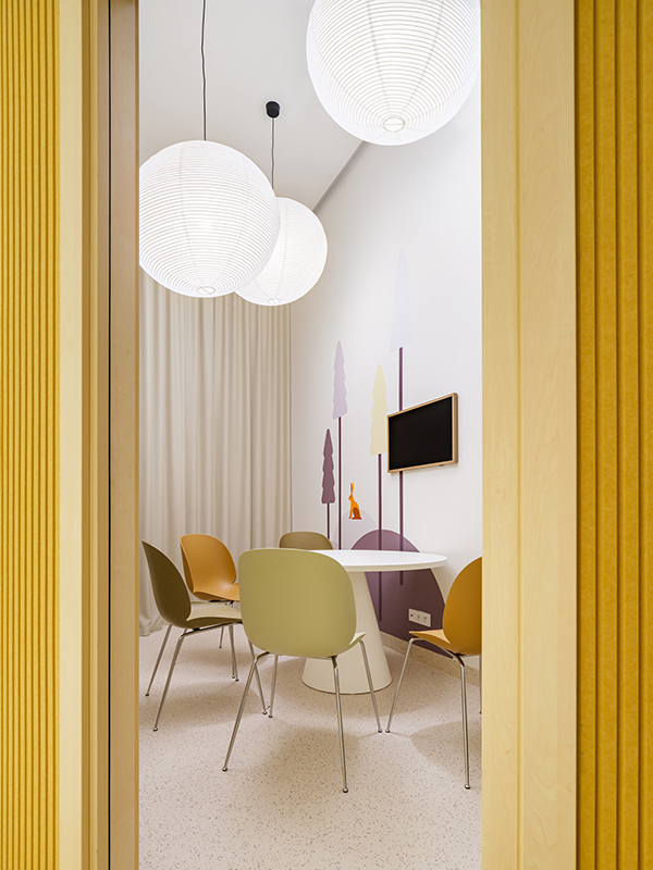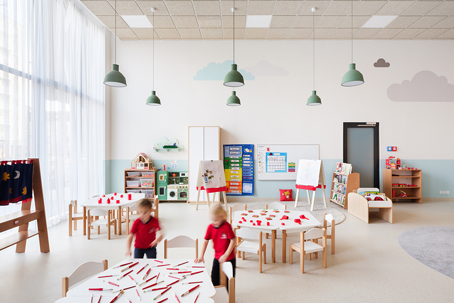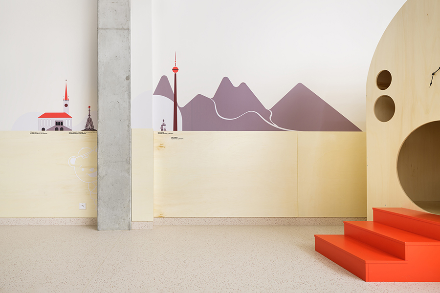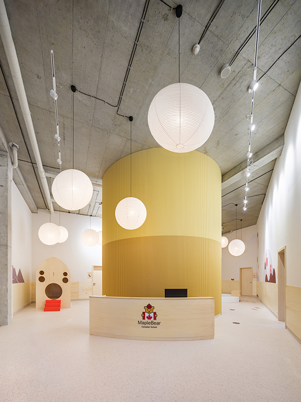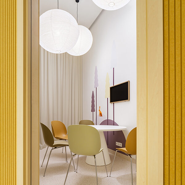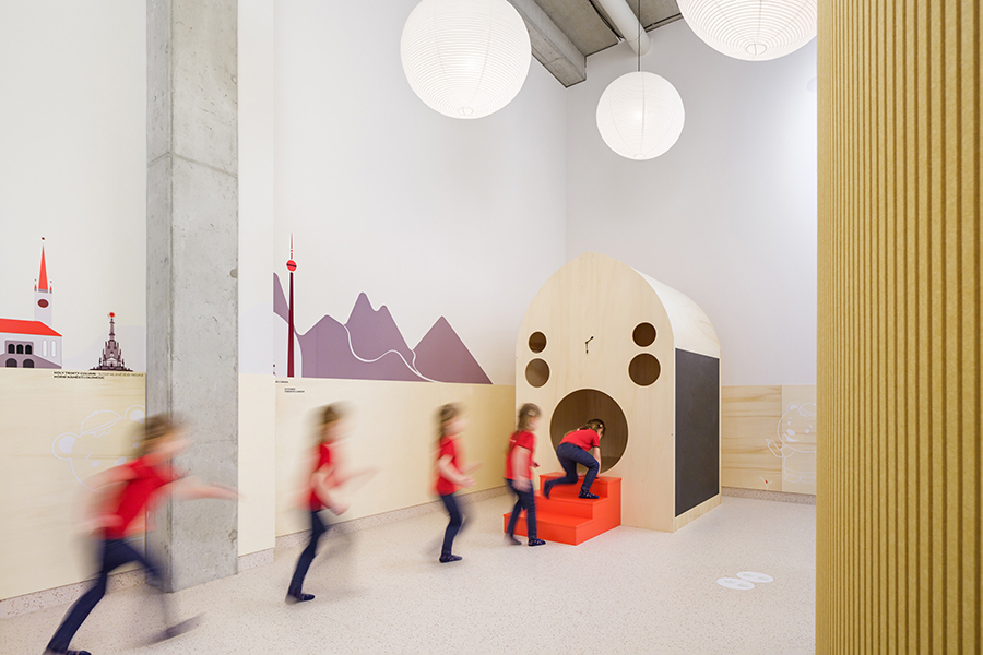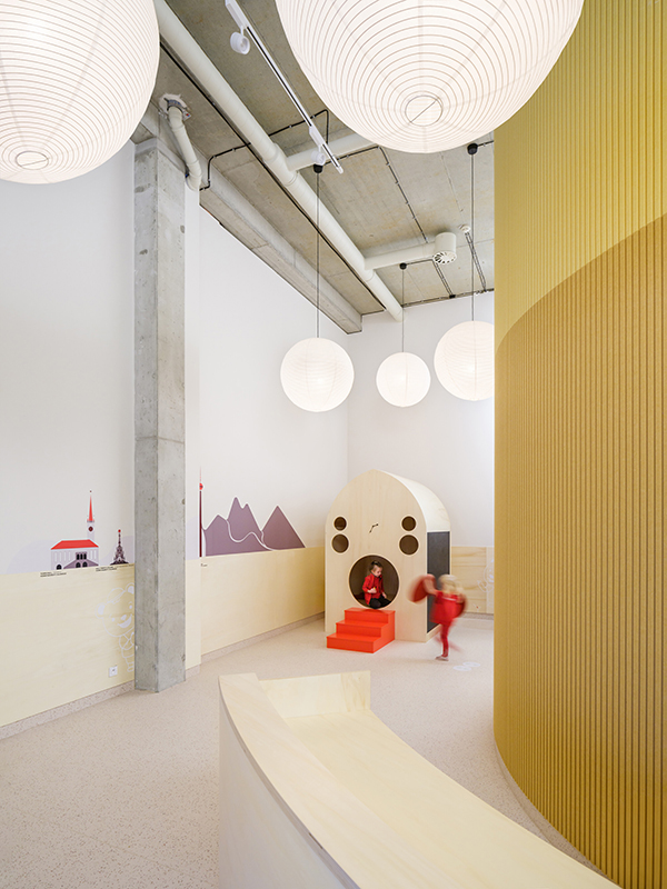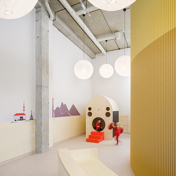 In Olmütz entstand innerhalb eines Gründerzentrums ein Kindergarten, der auf klassische Flurstrukturen verzichtet und stattdessen um eine offene Mittelzone organisiert ist – ein zentraler Spiel-, Lese- und Begegnungsbereich. Ein leuchtend gelbes Raummodul dient als Rückzugs- und Gesprächsraum und prägt die räumliche Identität. Beiden Projekten gemeinsam ist eine starke emotionale und funktionale Codierung: Wandgrafiken verbinden kanadische Landschaftsmotive mit lokalen Sehenswürdigkeiten und schaffen so eine klare gestalterische Brücke zwischen internationalem Bildungsverständnis und regionaler Verortung. js