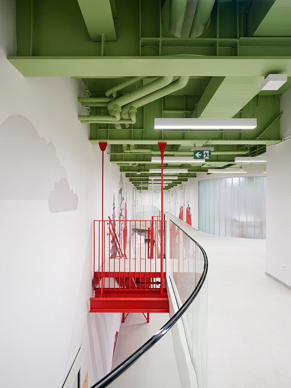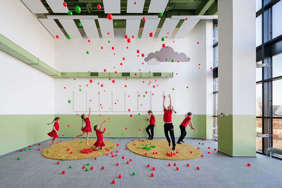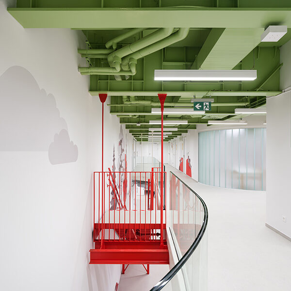Wie lässt sich ein globales Schulkonzept lokal verankern? SOA Architekti demonstrieren es mit zwei neuen Standorten in Brünn und Olmütz – Bildungsarchitektur, die pädagogische Prinzipien ebenso ernst nimmt wie kulturelle Bezüge. Die kanadische Marke Maple Bear, weltweit mit über 400 Einrichtungen vertreten, setzt in den beiden tschechischen Pilotprojekten auf eine unverwechselbare Farb- und Formensprache. In Brünn wurde ein ehemaliger Industriebau in eine zeitgemäße Grundschule transformiert. Die mehrgeschossige zentrale Halle bildet das Herz der Anlage: Sie vereint Empfang, Bibliothek, Rückzugs- und Spielzonen unter einem durchlässigen, lichtgeführten Dach. Markante Stahlträger in kräftigen Grün- und Rottönen rhythmisieren den Raum und verweisen zugleich auf die kanadische Herkunft des Bildungsmodells. Ergänzt wird das Schema durch gelbe Einbauten, helle Holzoberflächen und transluzente Glasfelder, die auch tief liegende Bereiche wie Mensa oder Besprechungsräume mit Tageslicht versorgen.