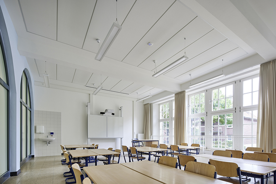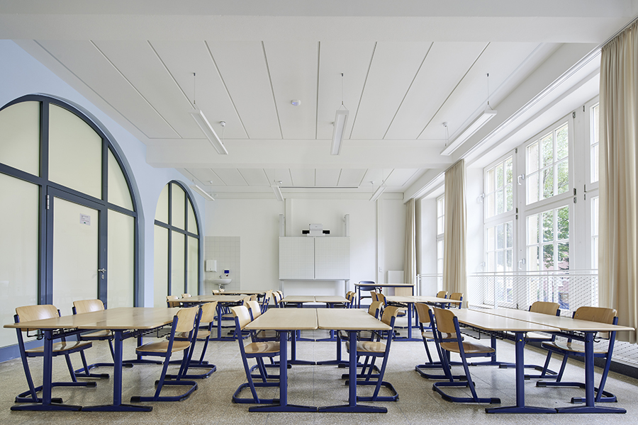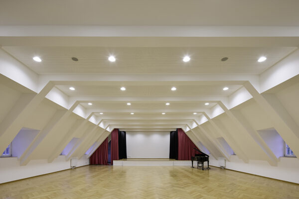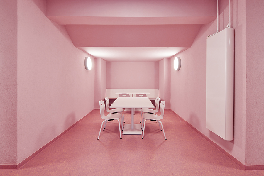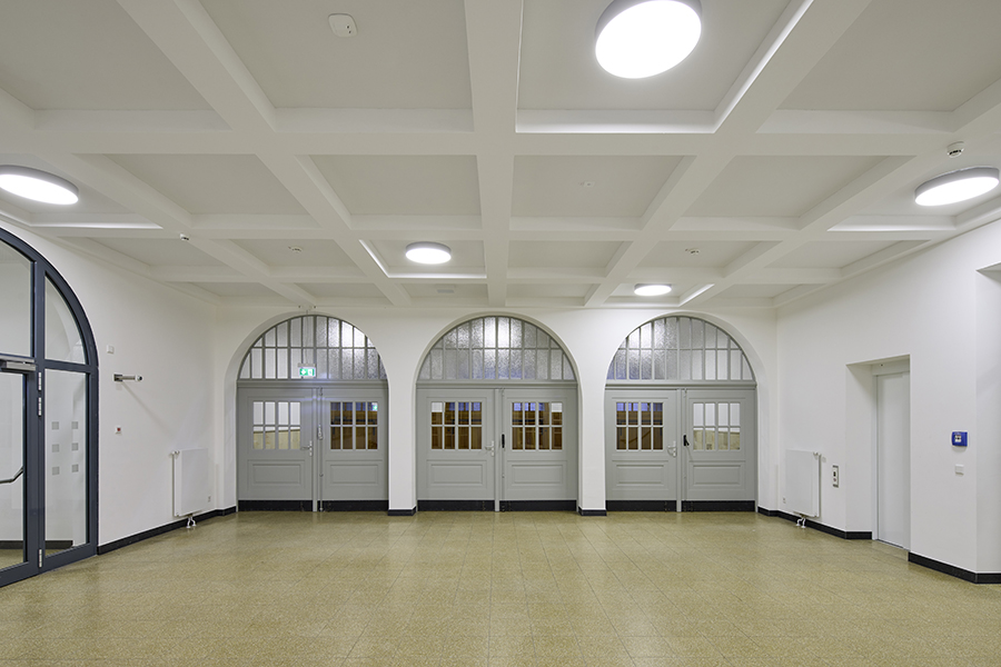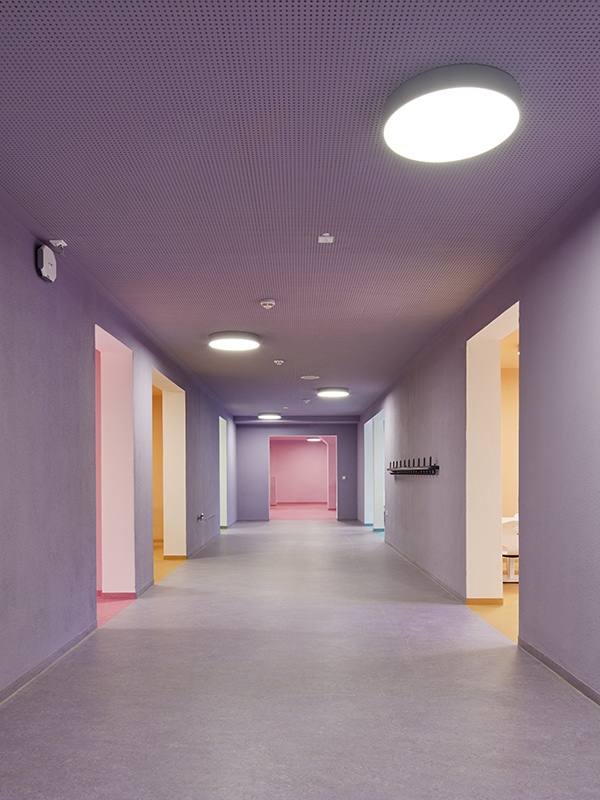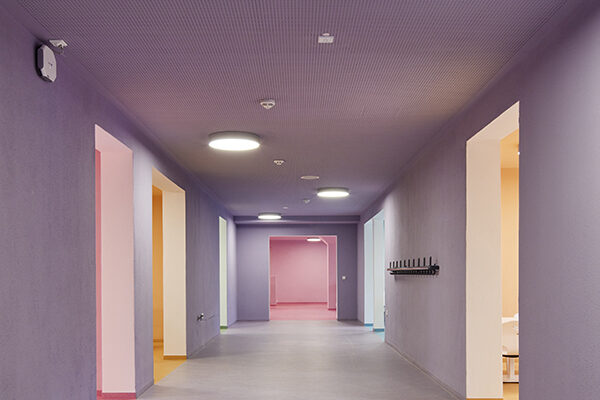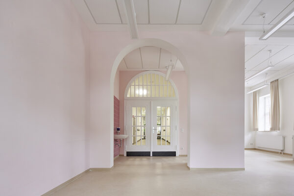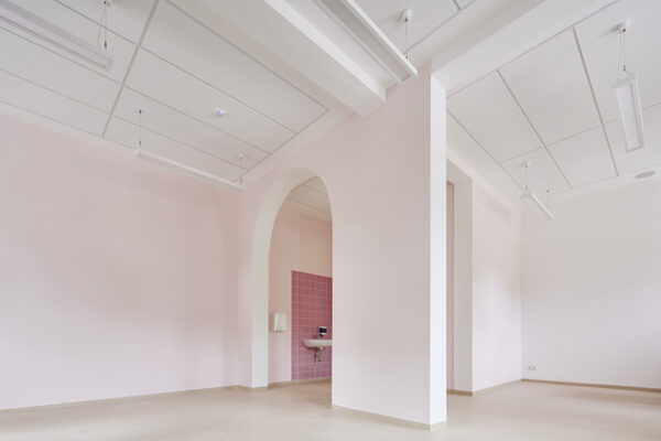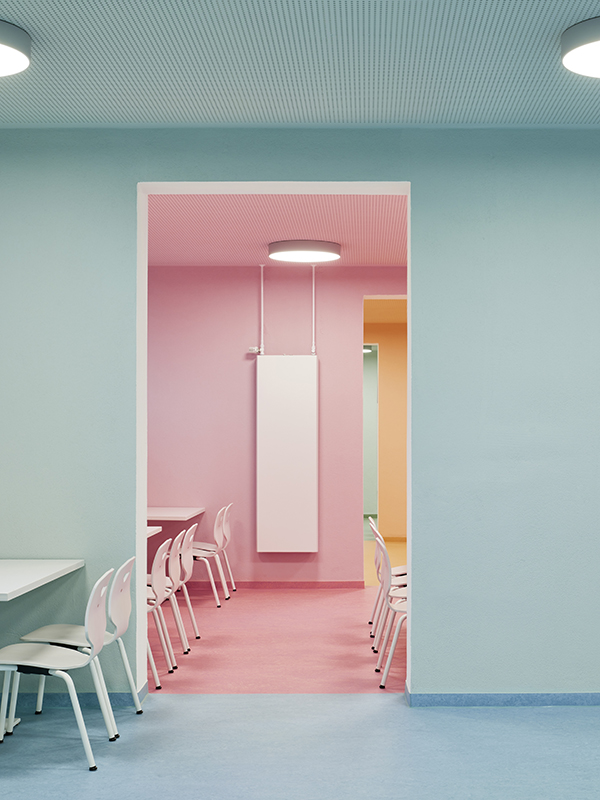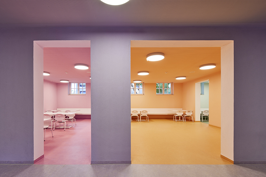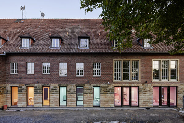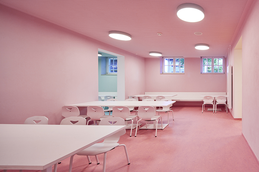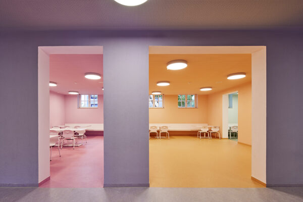 Mit dem Umbau der denkmalgeschützten Johannesschule erhält das „Kleine Schulzentrum Hiltrup“ an der Kardinalstraße in Münster einen neuen Mittelpunkt. Künftig bietet das Gebäude nicht nur zusätzlichen Raum für die Paul-Gerhardt-Schule und die Clemensschule, sondern fungiert vor allem als gemeinsamer Ort für Mittagessen, Betreuung und Begegnung. Zentral für das Konzept ist die neue Nutzung des Souterrains als Mensa mit Küche und Speiseräumen. Zur Schulhofseite wurden die vorhandenen Fensteröffnungen hierfür nach unten erweitert; zudem entstand eine vorgelagerte Terrasse, die als „grünes Klassenzimmer“ genutzt werden kann. Atmosphäre und kindgerechte Maßstäbe prägen auch das Innere. Die vorhandene kleinteilige Struktur des Bestands blieb weitgehend erhalten und wurde gezielt genutzt, um eine Abfolge kleiner „Esszimmer“ zu schaffen. Monochrome Farbtöne wie Hellblau, Rosa oder Orange an Boden, Wand und Decke verleihen den Räumen jeweils eine eigene Stimmung – mal warm und sonnig, mal frisch und lebendig, mal ruhig und geborgen. Auch die sanierte Aula im Obergeschoss steht wieder als zentraler Raum für Versammlungen und Veranstaltungen zur Verfügung. So verbindet das Projekt den sensiblen Umgang mit dem denkmalgeschützten Bestand mit einer zukunftsfähigen Nutzung und schafft einen Ort, an dem Schule nicht nur organisiert, sondern auch erlebt wird. js