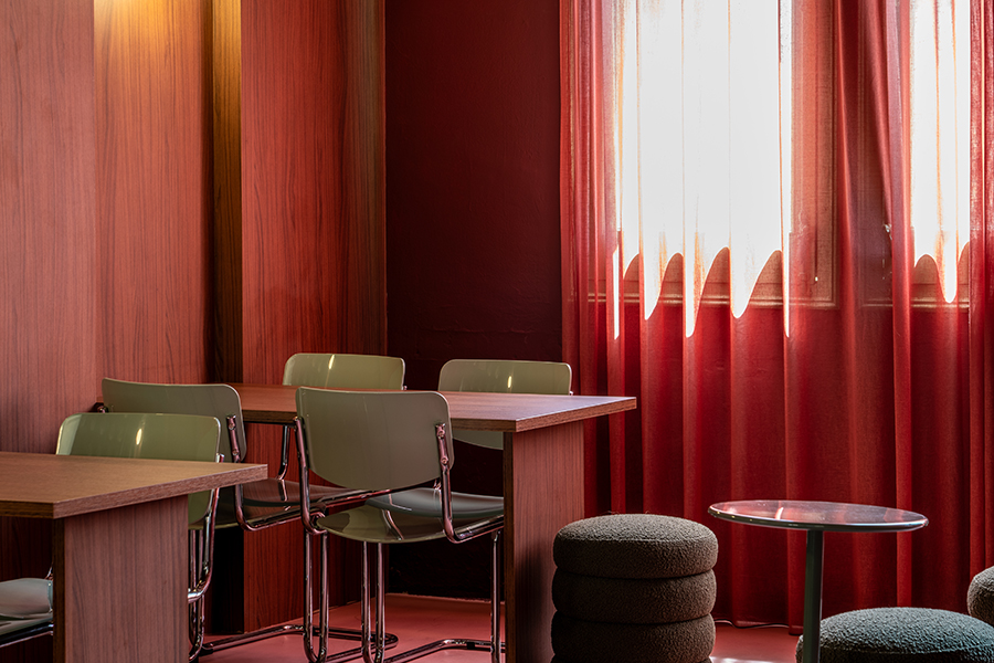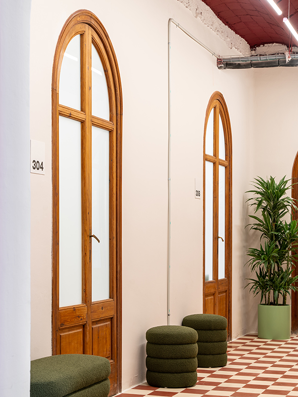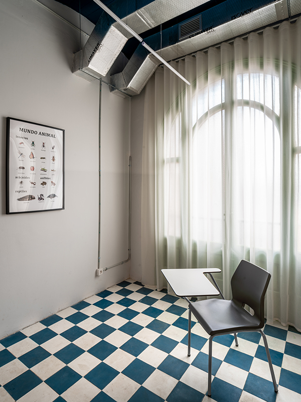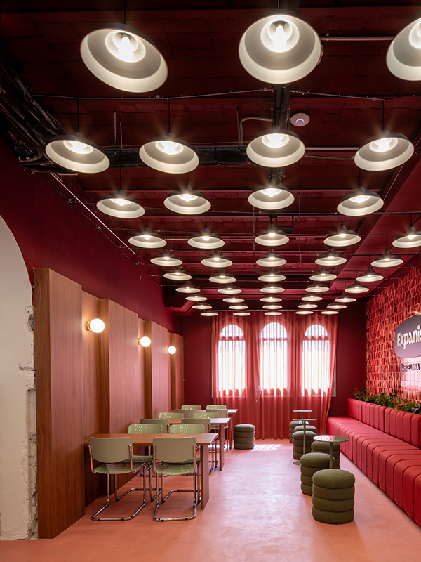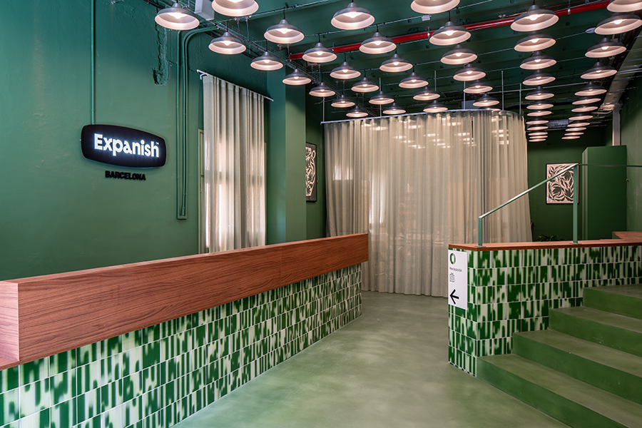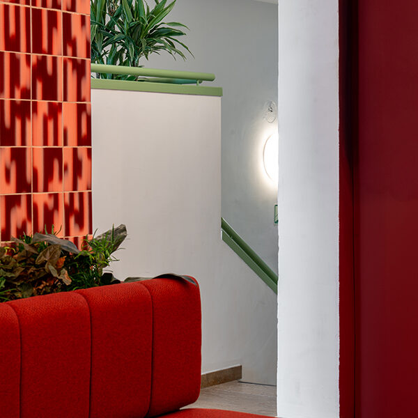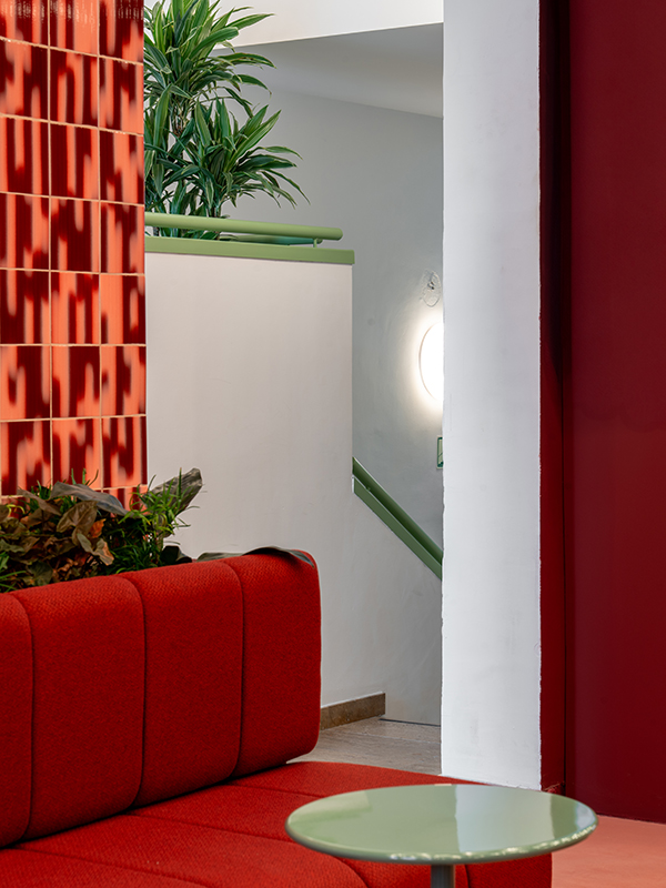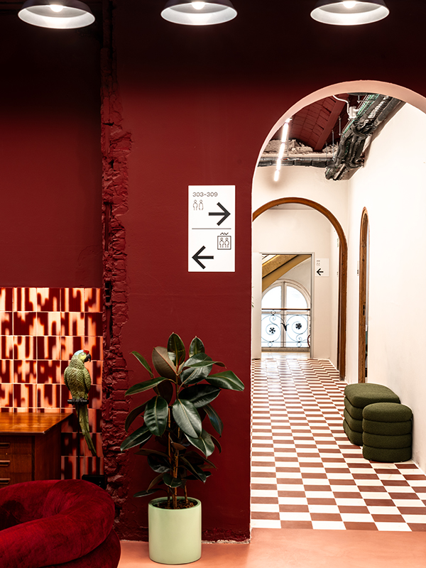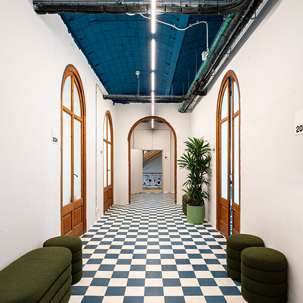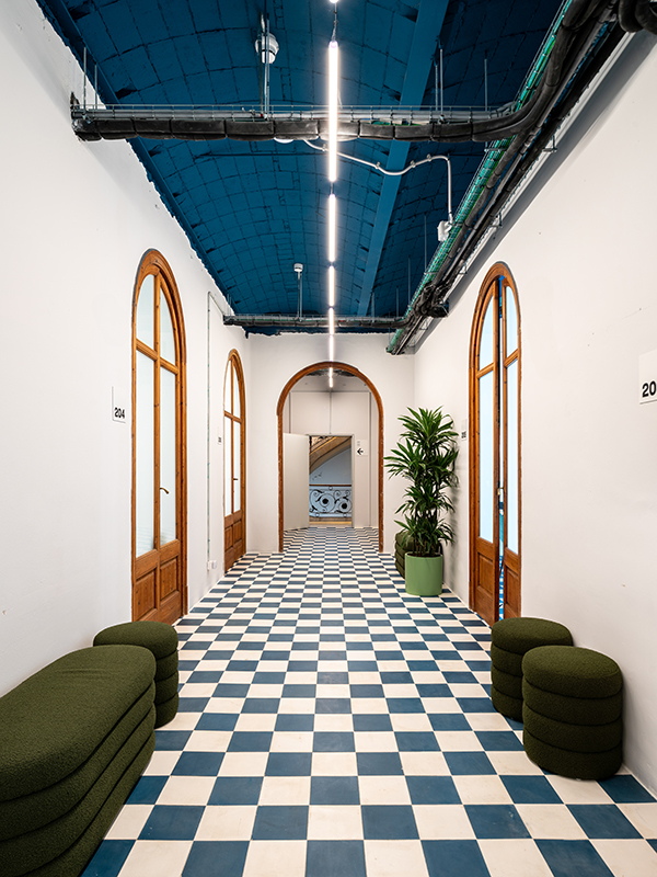 Keramikfliesen mit nuancierten Tonabstufungen, darüber ein Gewölbe, deckend im jeweiligen Geschosston gefasst: Bereits im Erdgeschoss wird deutlich, dass hier nicht Bestand und Umbau gegeneinander ausgespielt werden, sondern die Materialität als verbindendes Element wirkt. In der Casa Degli Italiani in Barcelona wurden vorhandene Holzbalkendecken, Gewölbe und Schmuckdetails behutsam freigelegt, ergänzt und restauriert, ohne die Spuren der Zeit zu nivellieren. „Unser Ziel war es, einen respektvollen Dialog zwischen Alt und Neu zu schaffen“, erklärt Alberto Eltini. „Es geht nicht darum, die Vergangenheit auszulöschen, sondern sie in die Gegenwart zu integrieren, durch eine Architektur, die das angesammelte Gedächtnis des Ortes bewahrt und stärkt.“ In dem im späten 18. und frühen 19. Jahrhundert errichteten Gebäude im Renaissancestil mit eklektischen Einflüssen entstand unter der Leitung von Alberto Eltini und Marina Martín ein Lernort für die Sprachschule Expanish. Das Raumprogramm greift lokale Referenzen auf: Die Gemeinschaftszonen heißen „Tapas“ und funktionieren als kommunikative Table-Settings, während die „Siesta Spaces“ kleine Rückzugsorte im Tagesablauf markieren. Die Farbdramaturgie führt geschossweise durch das Haus – im ersten Obergeschoss ein Schachbrett aus Zementfliesen in Blau und Weiß, im zweiten in Weiß und Rot. Farbige Beläge und monochrome Anstriche rahmen Wände und Decken. Maßgefertigte Möbel und Grünpflanzen halten die Eingriffe präzise und weitgehend reversibel. js