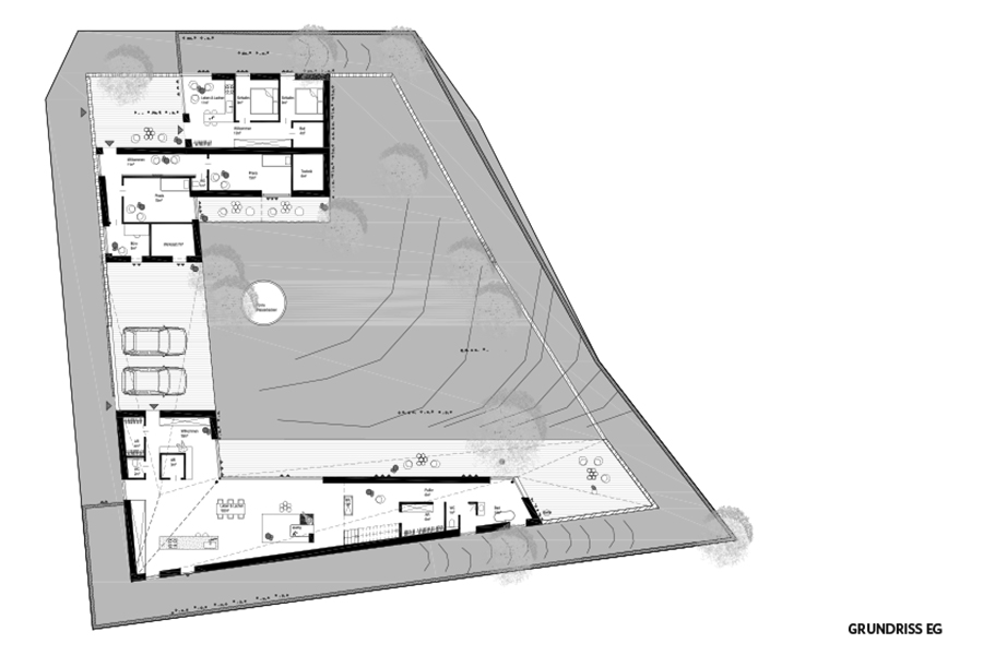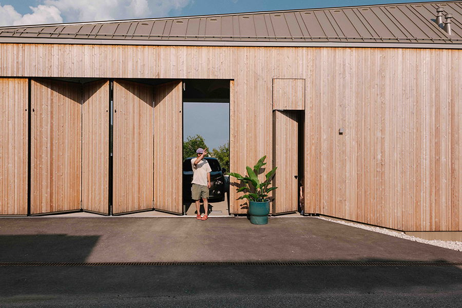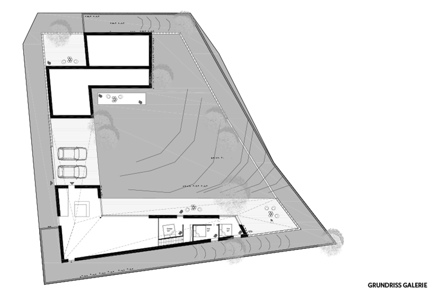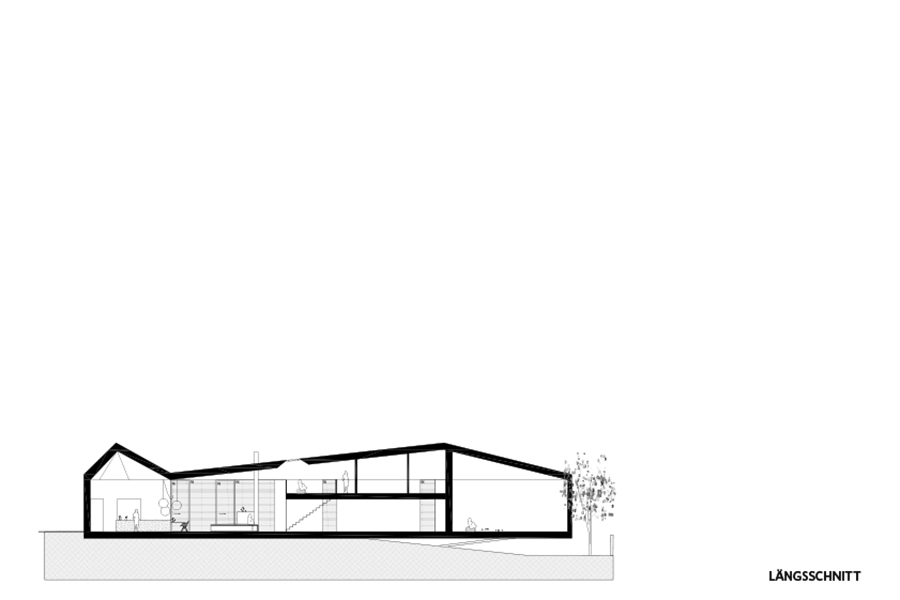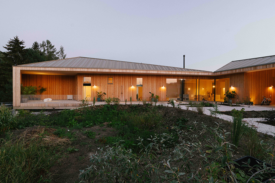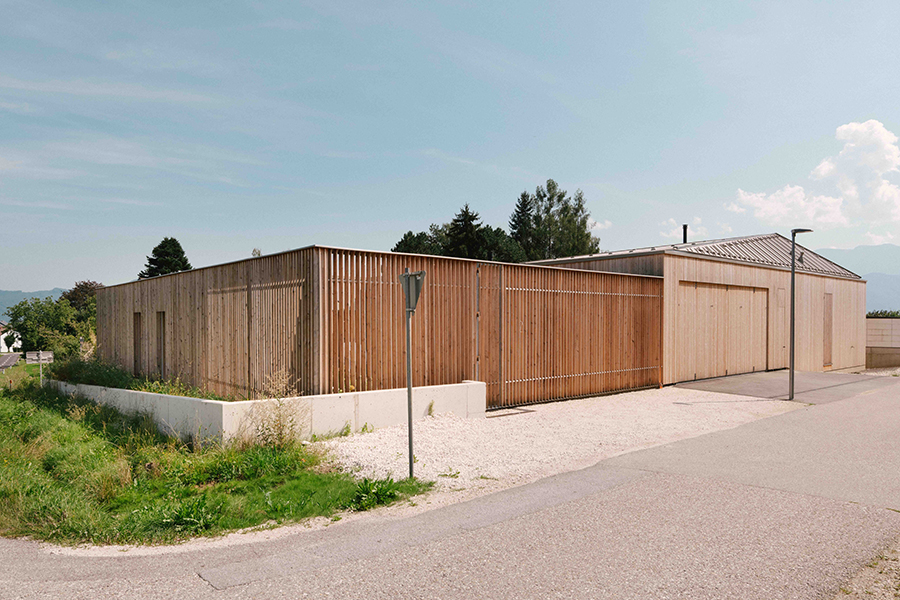 Nana Architektur interpretiert das Prinzip des Vierkanthofs in Abtsdorf am Attersee in einer zeitgenössischen Formensprache. Der Entwurf vereint Wohnhaus, Praxis und Ferienwohnung unter einem gemeinsamen Dach, verbunden über ein Carport, das zugleich Schwelle und Pufferzone bildet. Die äußere Erscheinung bleibt bewusst zurückhaltend: Eine offene Holzfassade umhüllt den Baukörper, während das weit gespannte Satteldach als topografische Geste Bezug auf die alpine Kulisse des Höllengebirges nimmt. Im Inneren prägen klare Sichtachsen, natürliche Holzoberflächen und eine durch die Dachgeometrie gegliederte Raumstruktur das Ambiente. Nicht raumhohe Boxen sind in die Dachlandschaft eingestellt, wodurch ein durchgängiges Raumkontinuum erlebbar bleibt. Herzstück ist der großzügige Wohnbereich mit rahmenloser Schiebeverglasung, die den Übergang zur Terrasse und zum Selbstversorgergarten öffnet. Holz, Betonfertigteile und Dreischichtplatten bestimmen Konstruktion und Innenausbau, ergänzt durch vollständig ausklappbare Verschattungselemente, die homogen in die Fassade integriert sind. Das Ergebnis ist ein klarer, funktionaler Baukörper, der zugleich regional verwurzelt und zeitgenössisch ist. js