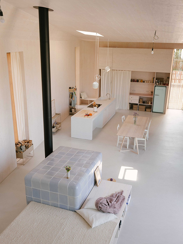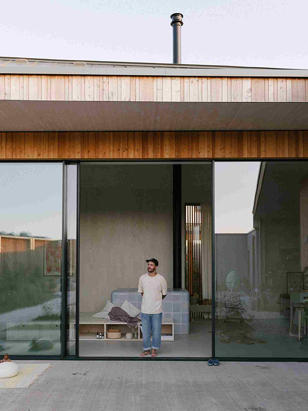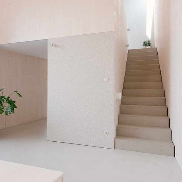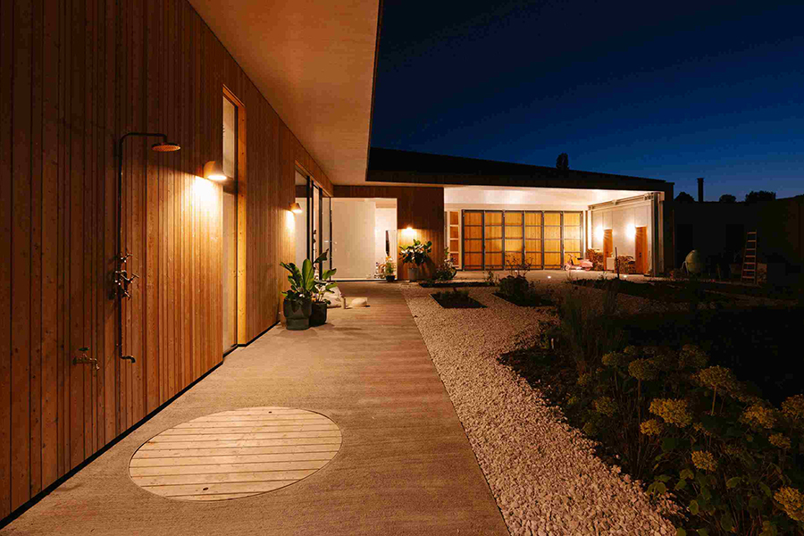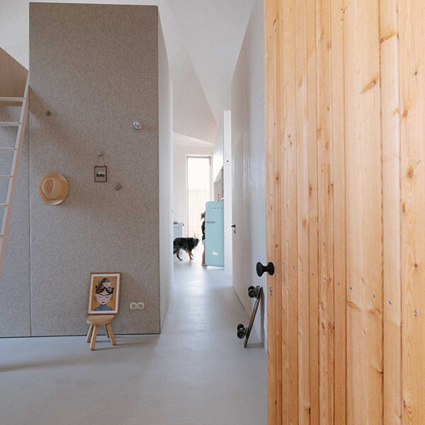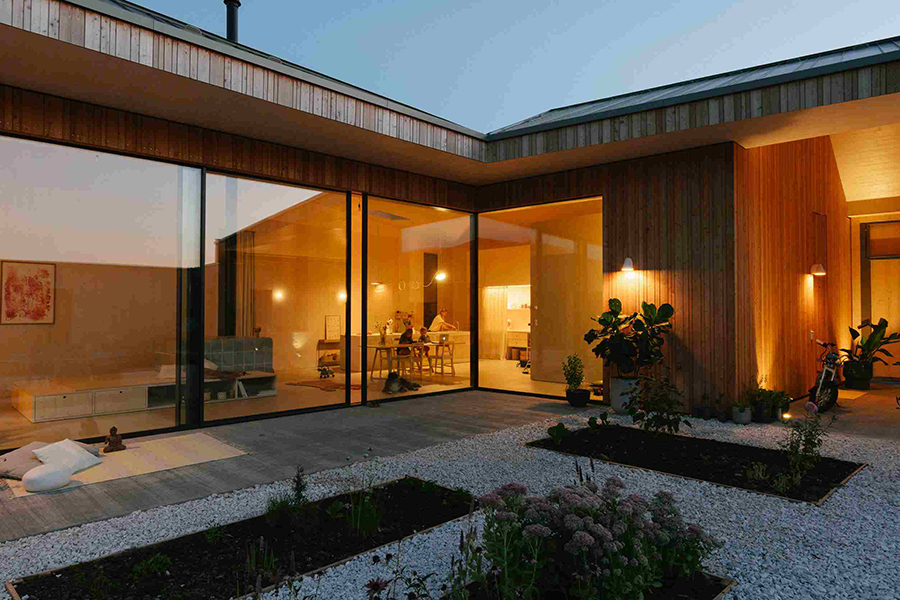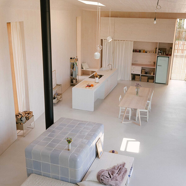 Nana Architektur interpretiert das Prinzip des Vierkanthofs in Abtsdorf am Attersee in einer zeitgenössischen Formensprache. Der Entwurf vereint Wohnhaus, Praxis und Ferienwohnung unter einem gemeinsamen Dach, verbunden über ein Carport, das zugleich Schwelle und Pufferzone bildet. Die äußere Erscheinung bleibt bewusst zurückhaltend: Eine offene Holzfassade umhüllt den Baukörper, während das weit gespannte Satteldach als topografische Geste Bezug auf die alpine Kulisse des Höllengebirges nimmt. Im Inneren prägen klare Sichtachsen, natürliche Holzoberflächen und eine durch die Dachgeometrie gegliederte Raumstruktur das Ambiente. Nicht raumhohe Boxen sind in die Dachlandschaft eingestellt, wodurch ein durchgängiges Raumkontinuum erlebbar bleibt. Herzstück ist der großzügige Wohnbereich mit rahmenloser Schiebeverglasung, die den Übergang zur Terrasse und zum Selbstversorgergarten öffnet. Holz, Betonfertigteile und Dreischichtplatten bestimmen Konstruktion und Innenausbau, ergänzt durch vollständig ausklappbare Verschattungselemente, die homogen in die Fassade integriert sind. Das Ergebnis ist ein klarer, funktionaler Baukörper, der zugleich regional verwurzelt und zeitgenössisch ist. js