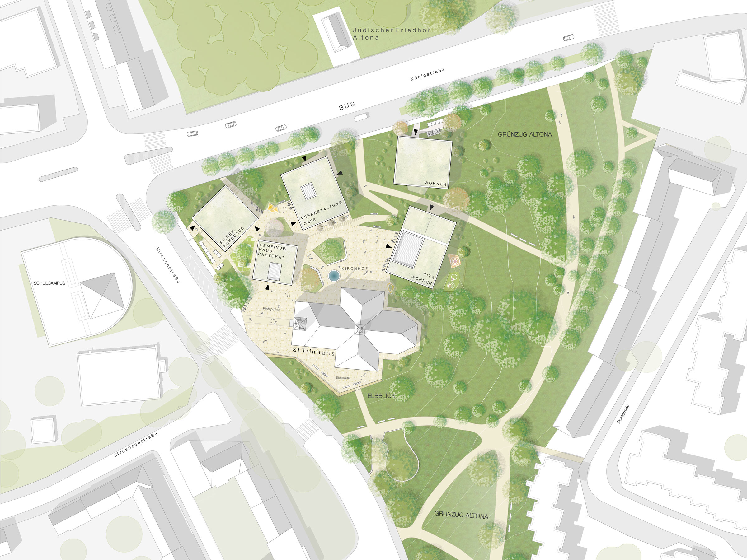 Das Trinitatis Quartier entsteht als zukunftsweisendes Gemeindezentrum, das gleichermaßen den Anforderungen einer sozial integrierten Stadtentwicklung wie auch einer sensiblen baulichen Einbindung in das bestehende Stadtgefüge gerecht wird. Ziel ist die Schaffung eines offenen und inklusiven Ortes, an dem Menschen unterschiedlichster Hintergründe zusammenkommen und Gemeinschaft leben können. Städtebaulich knüpft das Quartier an die gewachsene Struktur und die angrenzenden Grünräume an. Durchlässigkeit, vielfältige Blickbeziehungen und klare Bezüge zur Landschaft prägen das Konzept. Die neuen Baukörper gruppieren sich als Ensemble um die St.-Trinitatis-Kirche und bilden ein Gefüge aus Höfen, Sichtachsen, Durchwegungen und hochwertigen Freibereichen. Dabei bleibt die bedeutende Sichtachse auf das Nordportal der Kirche erhalten, ohne eine künstliche Überbetonung durch starre Achsenbildung zu erzeugen.