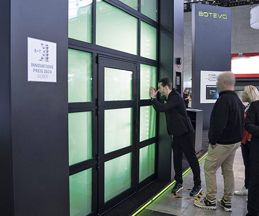 BOTEVO VISION ergänzt Toranlagen um softwaregesteuerte Glaselemente, die von transparent bis blickdicht stufenlos regelbar sind. Das intelligente System vereint Anforderungen an Energieeffizienz sowie Sicht-, Einbruch- und Sonnenschutz mit dem Wunsch nach taghellem Arbeiten und Sichtbarkeit. BOTEVO VISION wurde mit dem R+T Innovationspreis 2024 in Silber ausgezeichnet und zum Patent angemeldet.