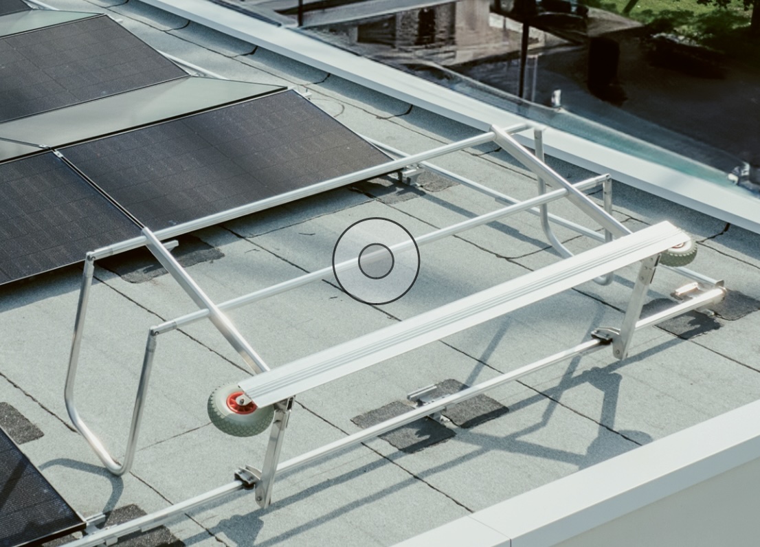 Ein einzigartiges PV-System: eine Kombination aus Absturzsicherung, Photovoltaik und Blitzschutz. Das Sys-tem kann mit zwei Varianten von Unterkonstruktionen und damit auf verschiedenen Dacharten genutzt werden. Mithilfe einer Schiene wird das mobile Geländer an der Unterkonstruktion befestigt, bei Bedarf aufgeklappt und zum Arbeitsplatz gefahren. In der eingeklappten Park-position verursacht das Geländer keine Verschattung.