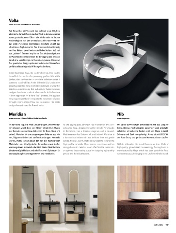 unten). Meridian ist eine ausgewogene Balance aus kla- Mediterranean feel (shown left and below). Meridian is Schwarz und Dark Iron gefertigt. Alape ist seit 2023 Teil