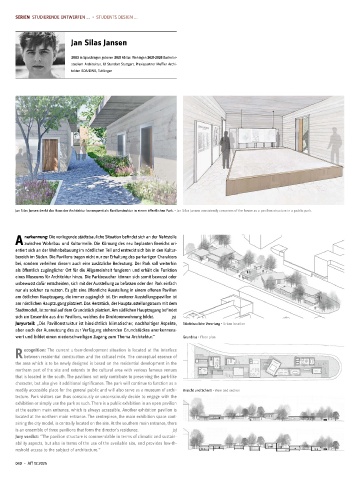 Jan Silas Jansen denkt das Haus der Architektur konsequent als Pavillonstruktur in einem öffentlichen Park. • Jan Silas Jansen consistently conceives of the house as a pavilion structure in a public park.